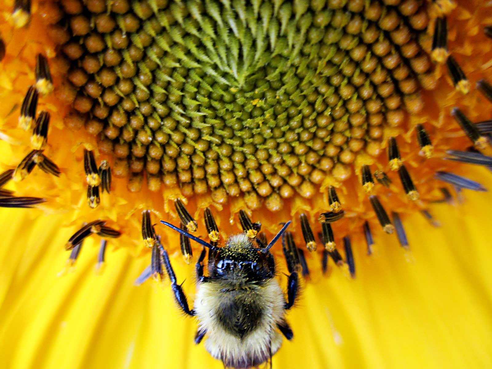 This bee head was just a bit blurry, and the tone was too blue, for some odd reason. After some sharpening and colour correction, this bee was ready to fly onto one of my happy birthday cards! The sunflower head is still blurry, but I planned to blur it further and add text over it, anyway. More on that soon!