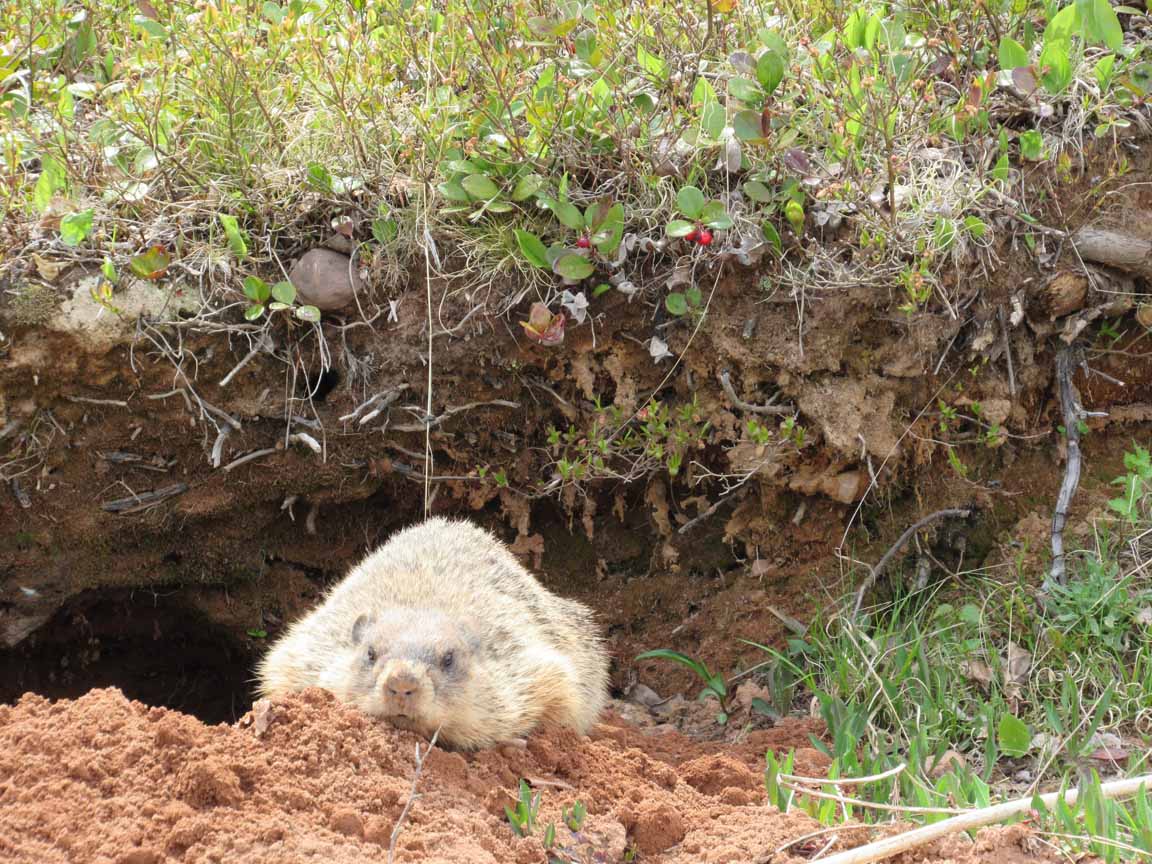 A photo of Jerry the groundhog relaxing in front of his burrow