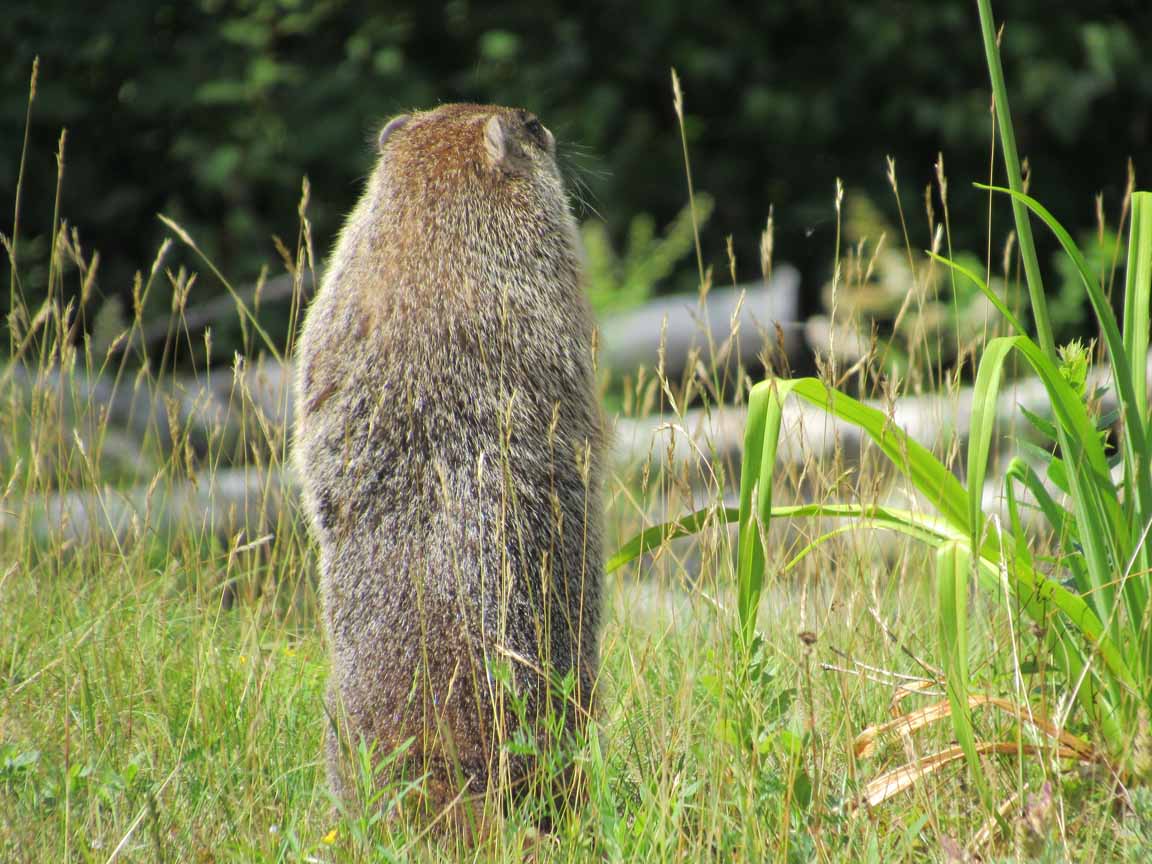 He seemed good-natured and patient with our frequent photo sessions. Watching him run down the hill was like watching a big furry caterpillar loping over some mushrooms.
