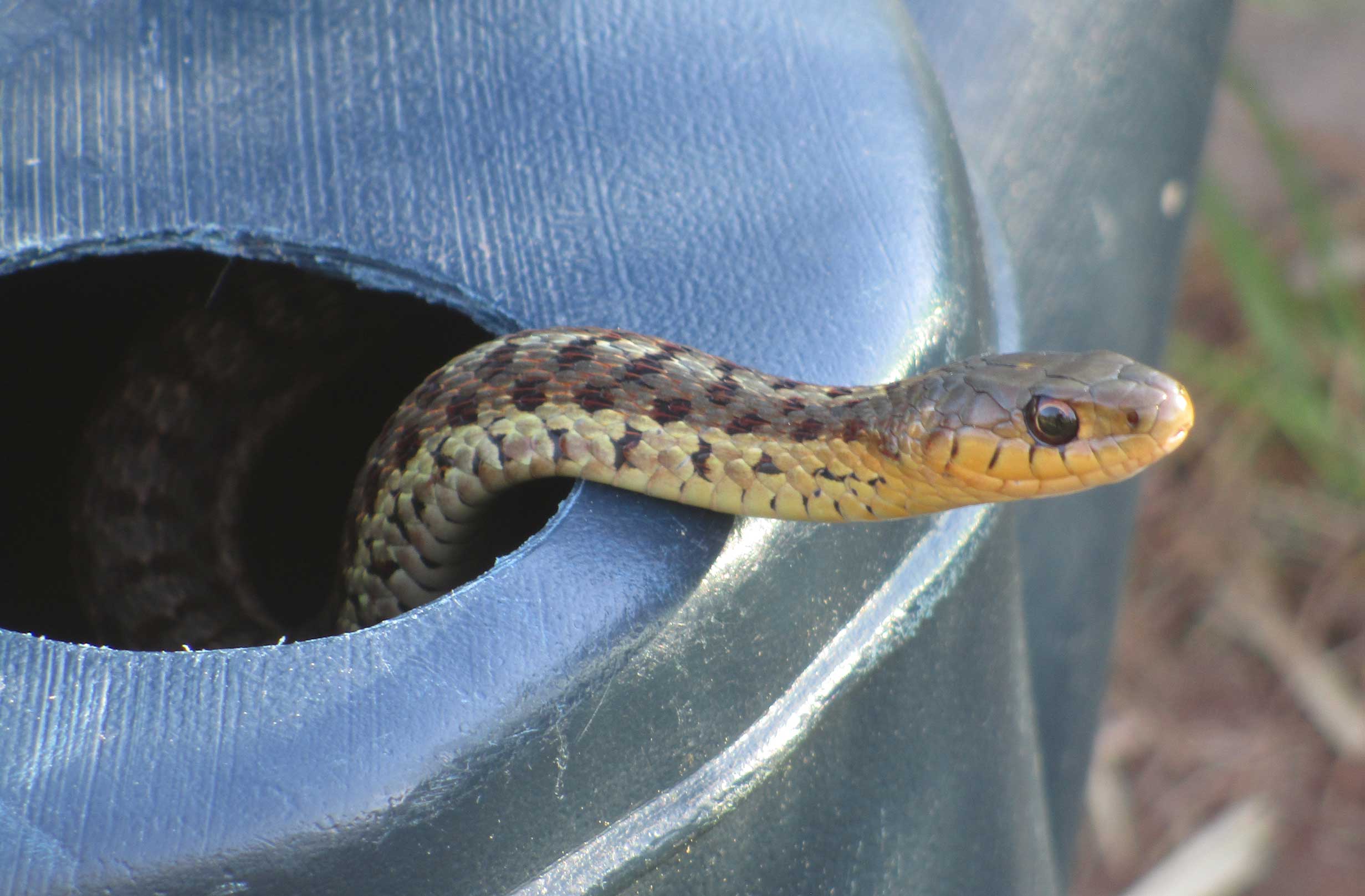 I came out with my camera to document the event. Sam eventually slid (reluctantly) out of the can and made his way back home. I followed him discreetly and was fascinated at how he instinctively knew where to go. The next morning, he was back inside the garlic bed. And now we always keep our watering cans filled with water.