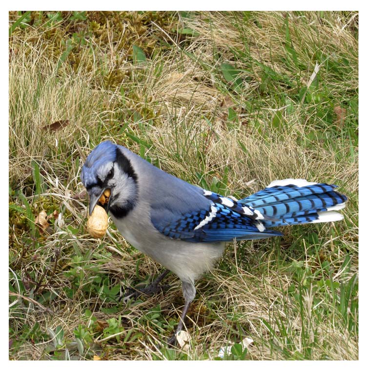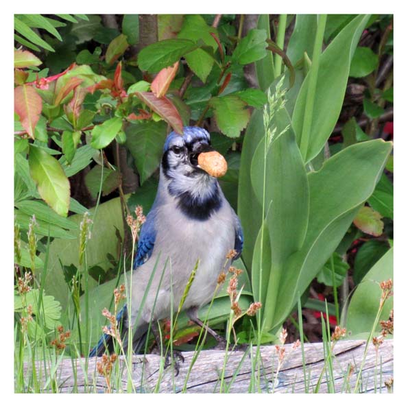 An article about my garden friends would not be complete without mentioning Birtie the blue jay. He and his extended family and friends visit often. Birtie is smart, sassy and very athletic in his attempts to obtain peanuts. He and his family quickly found ways to coax peanuts out of the humans living in the big blue house. Admittedly, we fall for them easily.