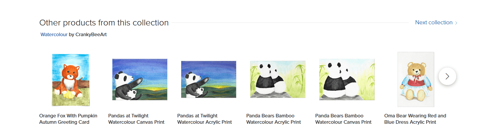 When you’re on a product page, scroll down a bit and you’ll often see both an “Other designs you might like” section and an “Other products from this collection” section following the main product photo.