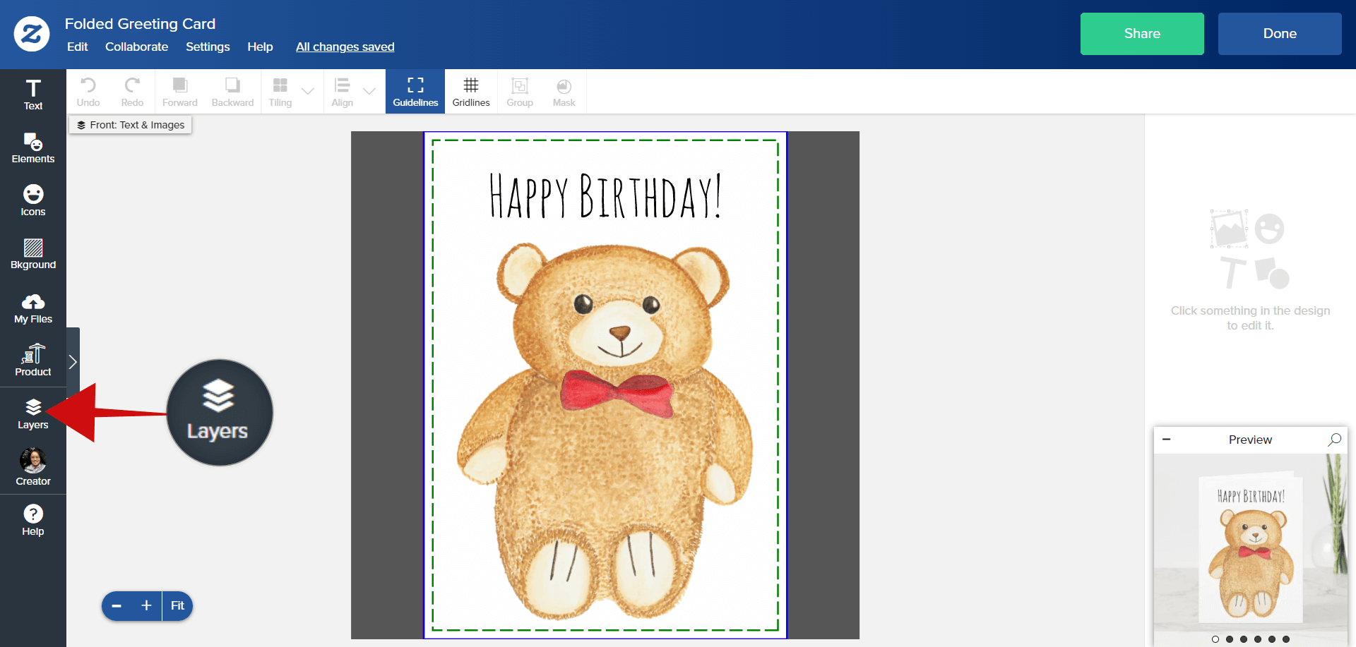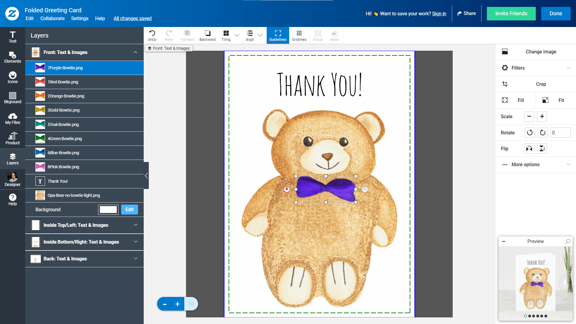 Okay, this card is just about done! But one other thing: You can also rearrange layers in the layers panel. The Opa Bear Birthday card, for example, allows you to change the colour of Opa Bear’s bowtie to match the recipient’s favourite colour! To do that, click the “Layers” panel on the left-hand side and go back to the front of the card. Choose the bowtie colour that you want and drag it to the top of the list. Ta-da! Opa Bear is now wearing a snazzy purple bowtie.